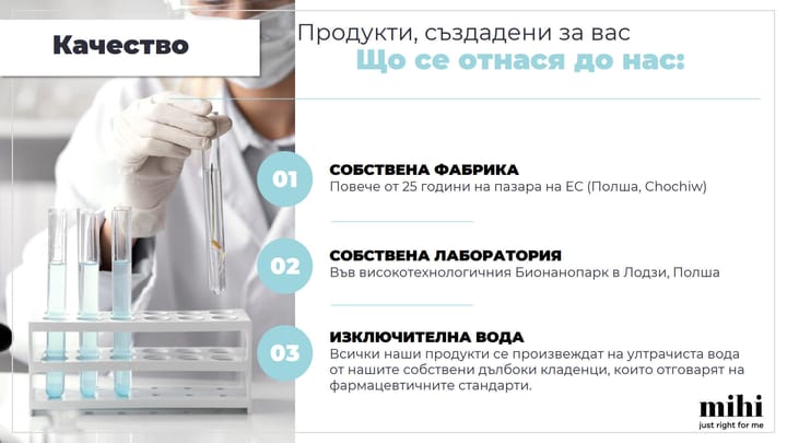 Достъпна козметика с патентована технология, базирана на медицински основи. Благодарение на иновативната формула, разработена в нашата собствена лаборатория, съчетаваща естествени съставки и съвременни технологии, козметиката активира регенерацията на кожата и не предизвиква алергии или кожни раздразнения.
