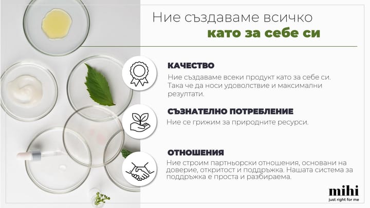 От самото начало Mihi се стреми да създаде най-благоприятните условия за сътрудничество. Вие изграждате своя бизнес, компанията създава условия за неговия успешен растеж – например създава стимулиращи събития, бонус програми и т.н. В този случай само вие определяте какво място заема бизнесът с Mihi в живота ви - дали ще бъде допълнителен или основен доход.